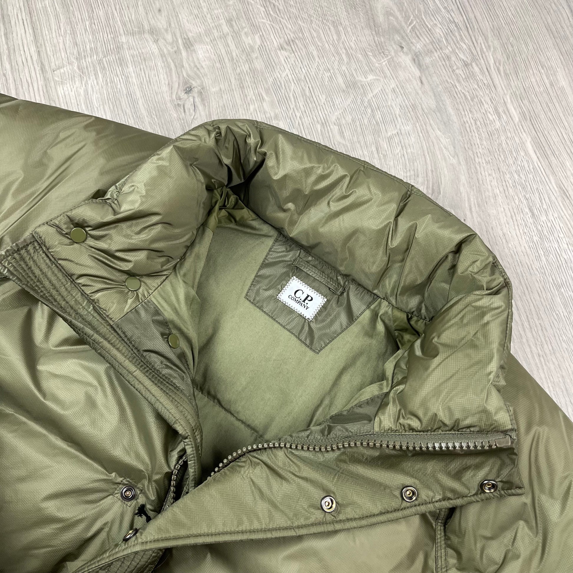 Capers khaki CP Company Down Shield Hooded Jacket with sleeve lens