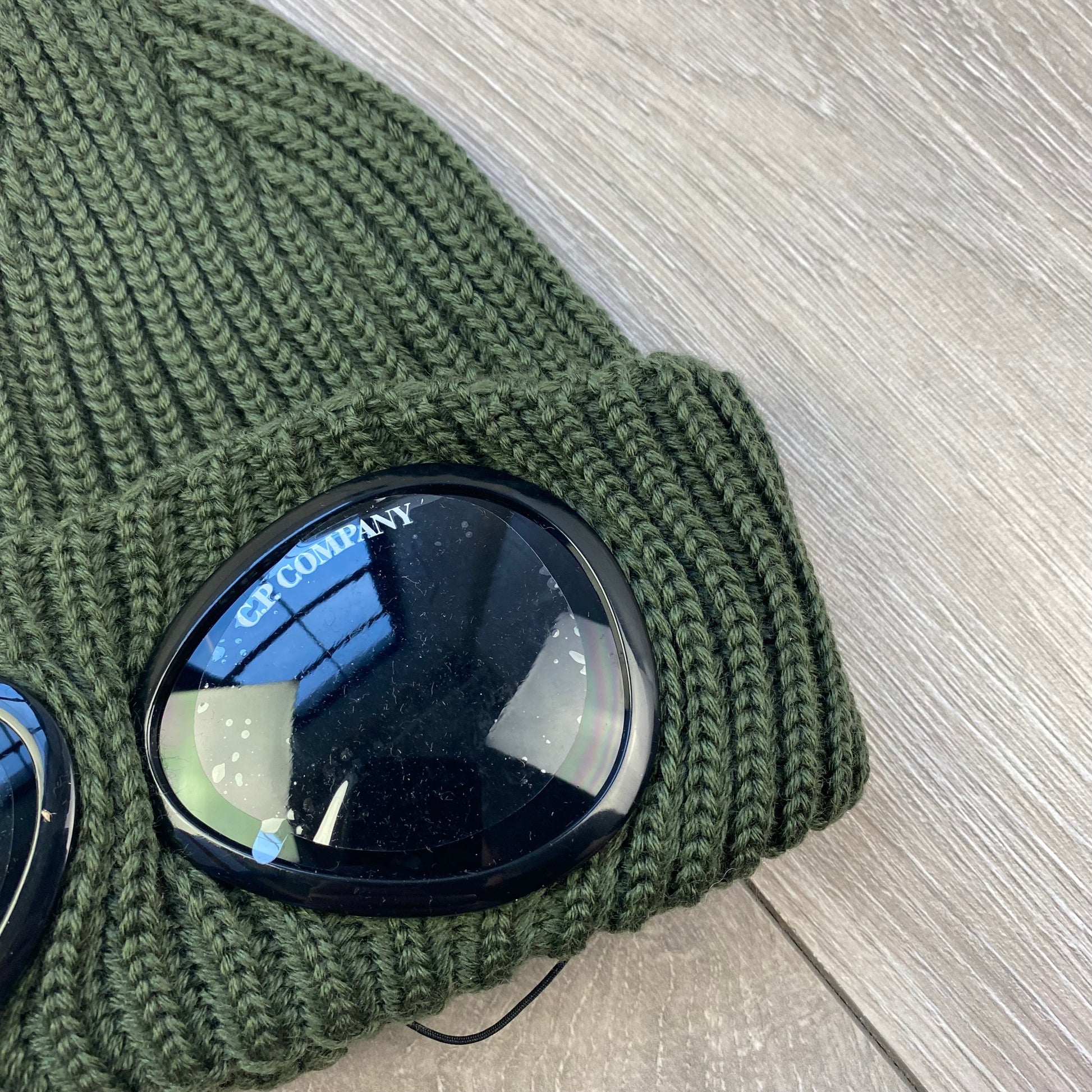Ivy Green CP Company merino wool beanie with goggle lens'