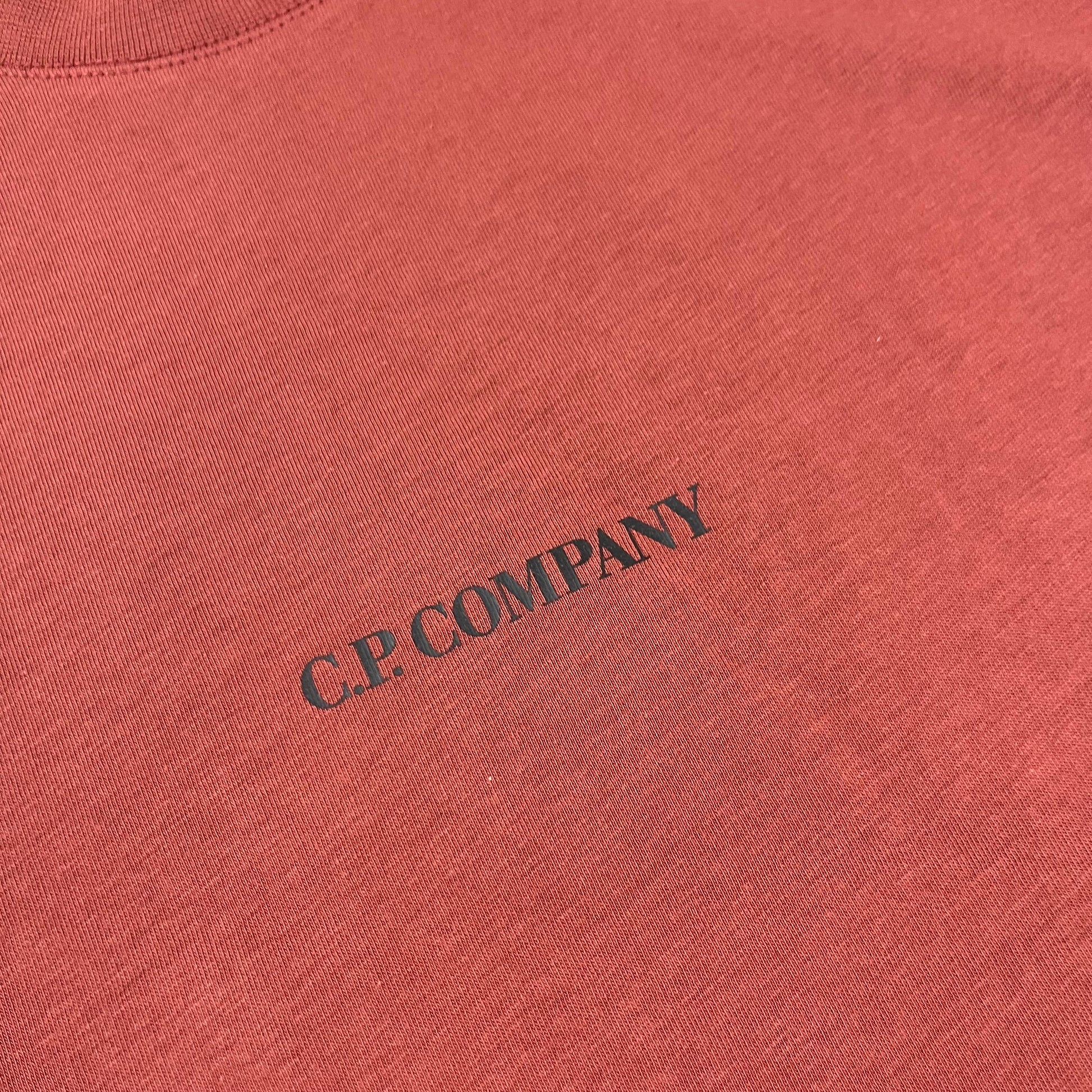 Henna Red CP Company 24/1 jersey resist dyed relaxed fit T-shirt with small black logo print on the chest. Resist dye products are coloured individually, and therefore colours aren't always uniform - this is intentional and part of the unique design. Colour irregularities are not a fault.