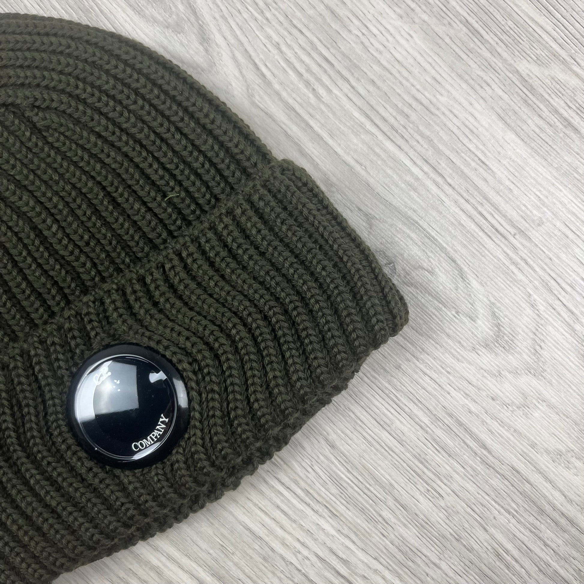 Ivy Green CP Company beanie with single goggle lens'