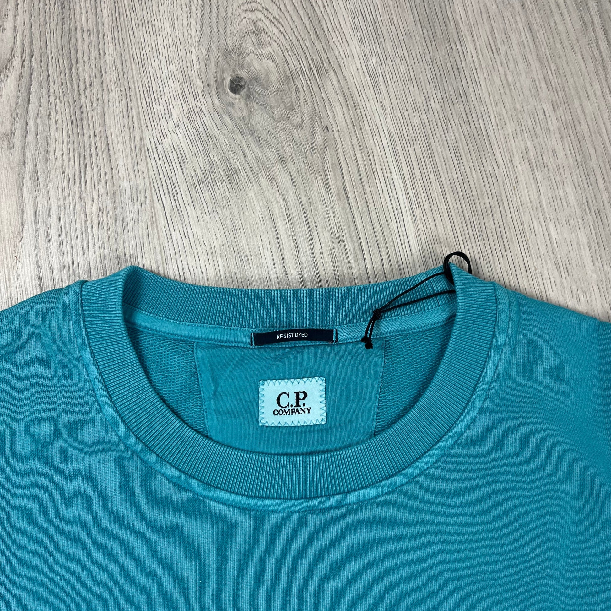 Tile Blue CP Company brushed & emerized resist dyed cotton fleece crew neck sweatshirt with embroidered patch logo. Resist dye products are coloured individually, and therefore colours aren't always uniform - this is intentional and part of the unique design. Colour irregularities are not a fault.