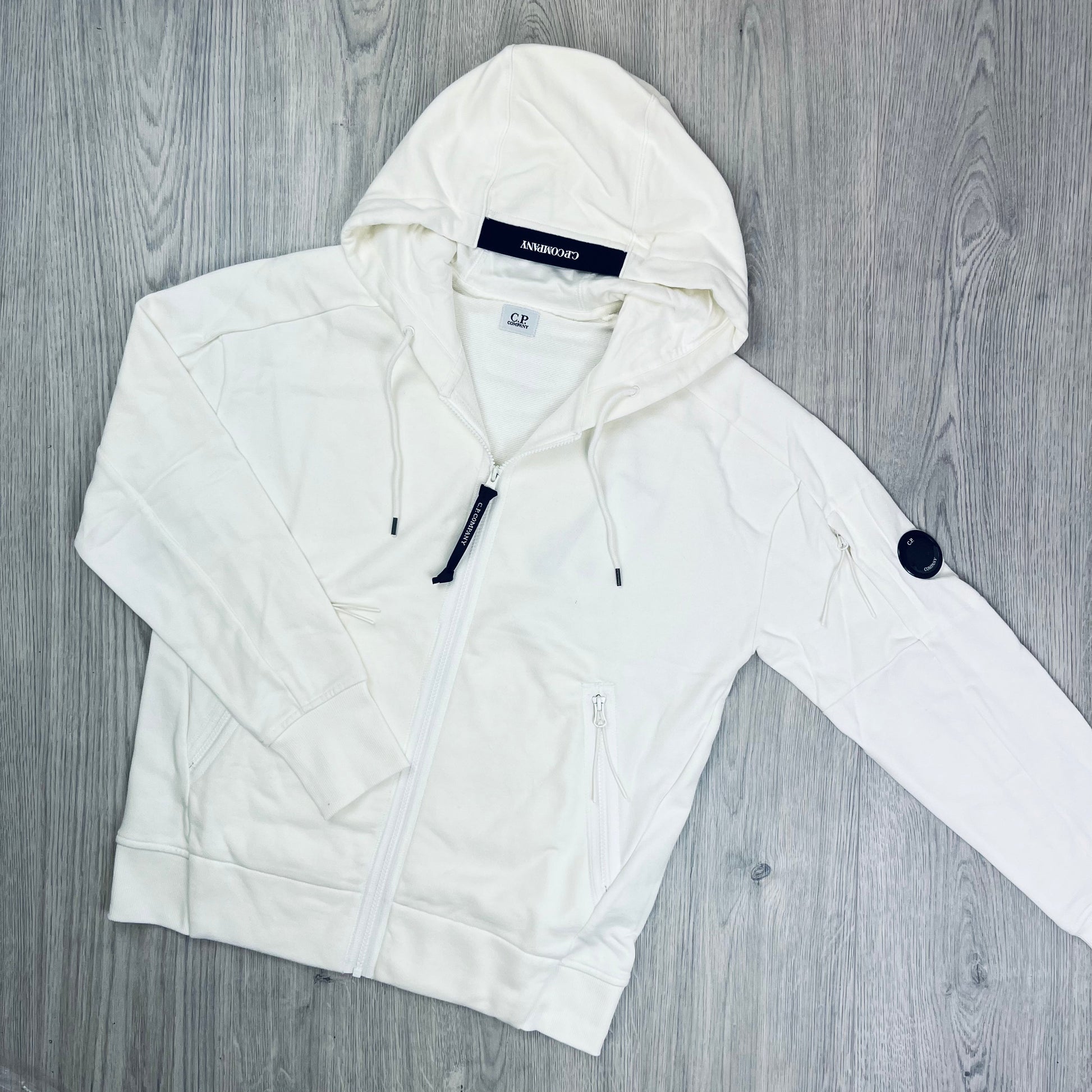 Gauze White CP Company raised fleece zip up hoodie with lens detail
