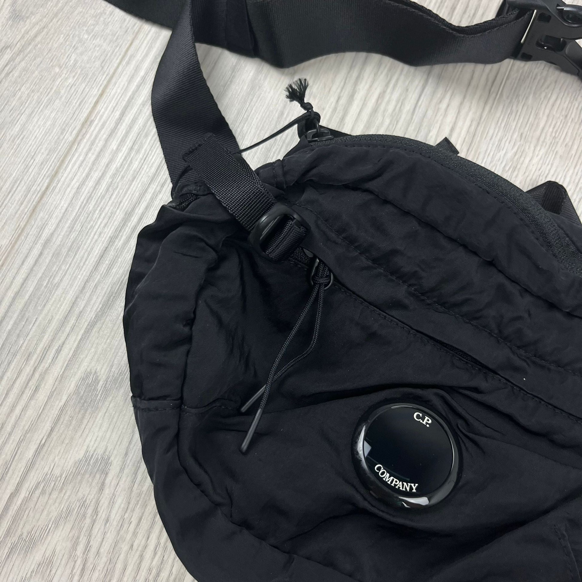 Black CP Company nylon body bag with lens detail