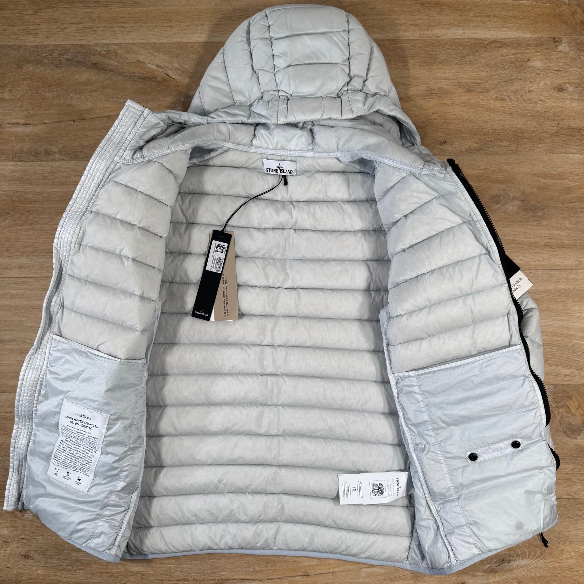 The hooded down jacket is crafted from lightweight recycled nylon, utilizing a special weaving technique that creates seamless down compartments directly from the loom, enhancing insulation and durability. The hood features a contour drawstring for adjustable coverage, while on-seam hand pockets with hidden zip fastenings provide secure storage. The Stone Island badge is displayed on the left sleeve. Cuffs and the bottom hem are edged with elasticated nylon tape for a snug fit. A two-way zip fastening, edged in herringbone nylon tape, completes the design.