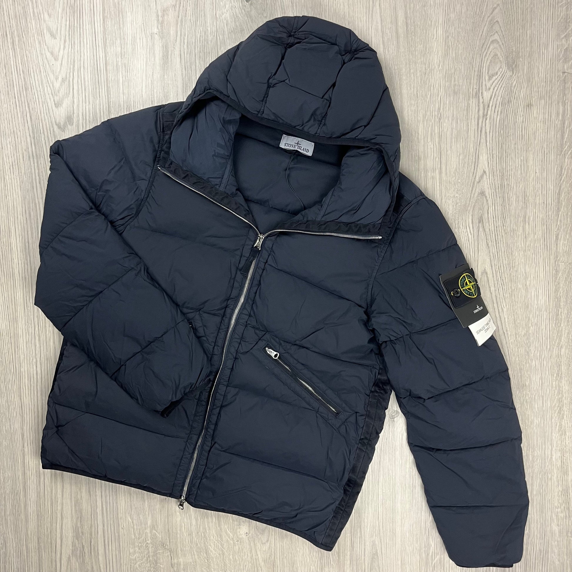 Navy Blue Stone Island Seamless Tunnel Nylon Down-TC blouson hooded jacket with sleeve badge